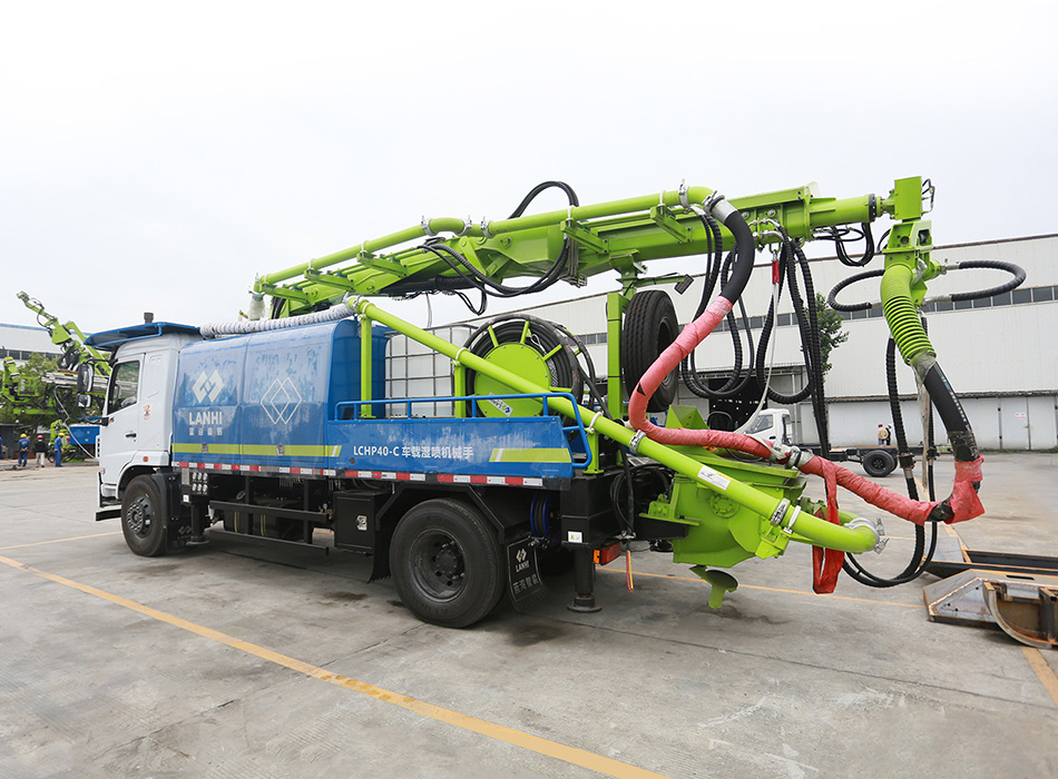 LCHP40D車載濕噴機(jī)械手采用汽車底盤,是一款綜合國內(nèi)隧道初支混凝土噴錨工藝及施工情況研發(fā)升 級的一款專用設(shè)備。該設(shè)備具有噴射方量大(最大噴射方量40m3/h)、不易堵管、回彈低、機(jī)動(dòng)性好、性能 穩(wěn)定可靠等特點(diǎn)。解決了傳統(tǒng)小型濕噴機(jī)不能滿足大、長隧道混凝土噴射的不足,提高了施工效率,減少了 混凝土消耗量,切實(shí)保障施工質(zhì)量。